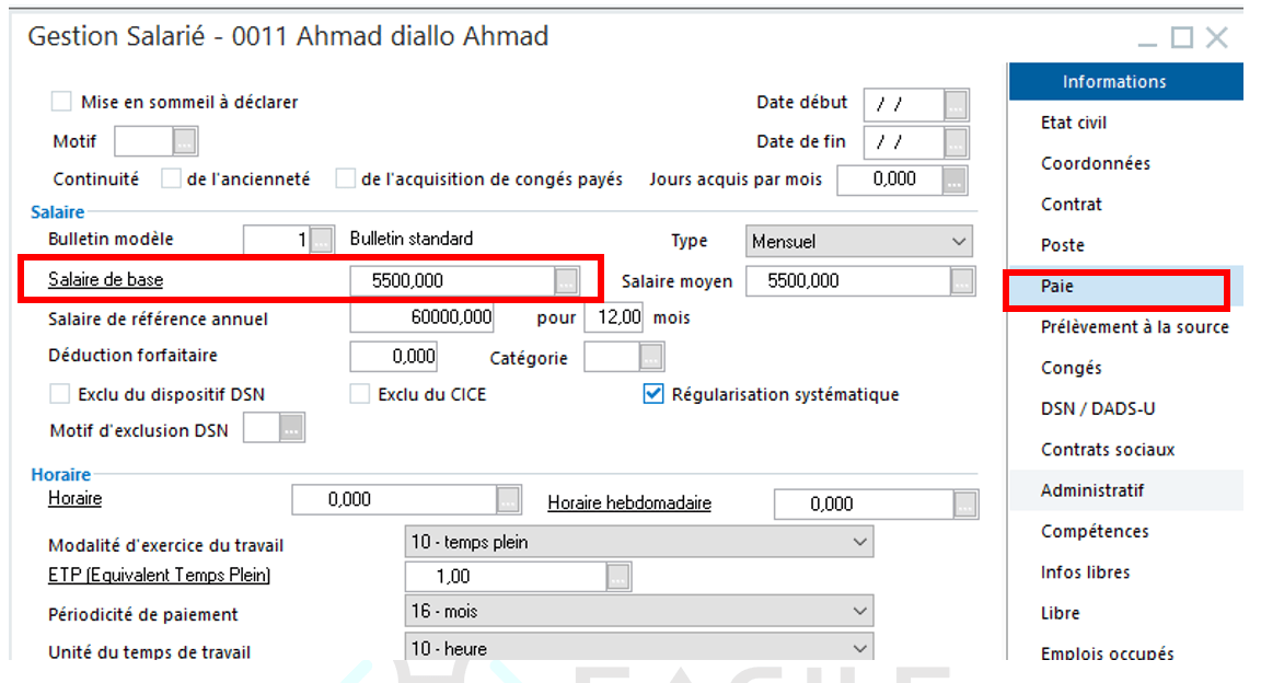 Lorsque vous ajoutez un nouvel employé dans votre fichier de paie, vous êtes appelé à renseigner son salaire de base dans l’onglet relatif à sa paie