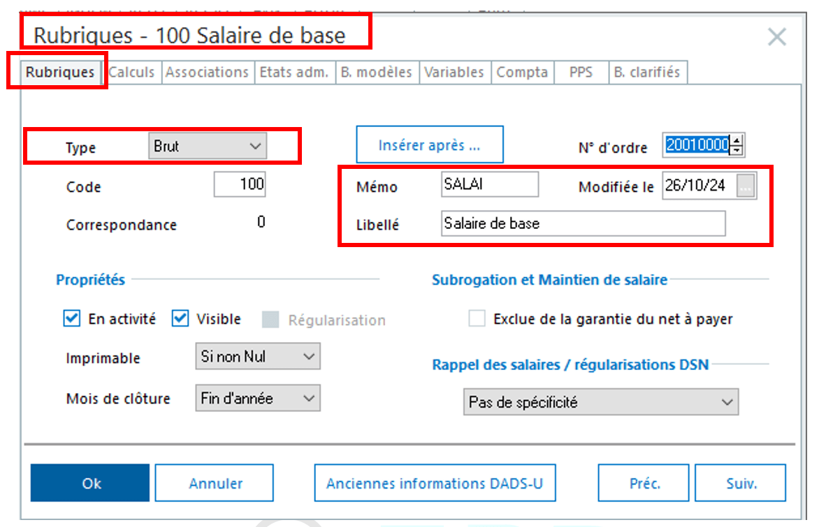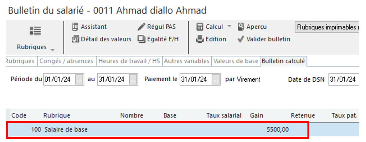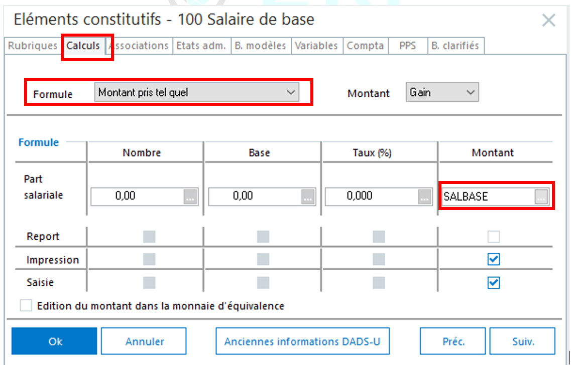 Pour pouvoir l’intégrer sur votre bulletin de salaire, vous devez configurer la rubrique de salaire de base ainsi :